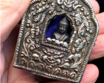 Tiny Refuge – This exquisite Gau amulet box was prepared and blessed by a guru. It’s just two inches high and is worn on a strap while traveling. It commonly holds a Sanskrit printed mantra for spiritual protection.