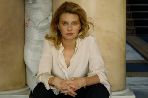 Olena Zelenska, the first lady of Ukraine, is the cover story for this month’s Vogue Magazine. She was photographed on the steps of a state building. She is sitting in front of pillars which appear to be fortified by sandbags. They are bags of grain being stored for her struggling nation.