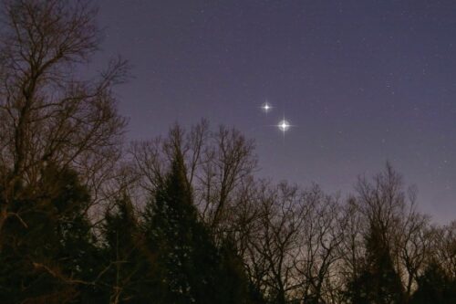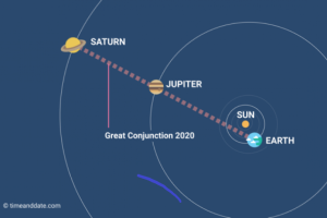 This week all eyes should be directed to the night sky. You might want to personally view this event which only occurs every twenty years. That’s the period of time that it takes for the two planets, Saturn and Jupiter in their individual orbits, to circle the Sun and return to the same visual location of the sky. From Visually these two huge bodies seem to be aligning. The beautiful thing about this planetary line-up is that for the past several months we’ve had the opportunity to view it’s gradual approach. After the exact conjunction on the December 21st we can also observe the planets disengage and resume their normal orbits.